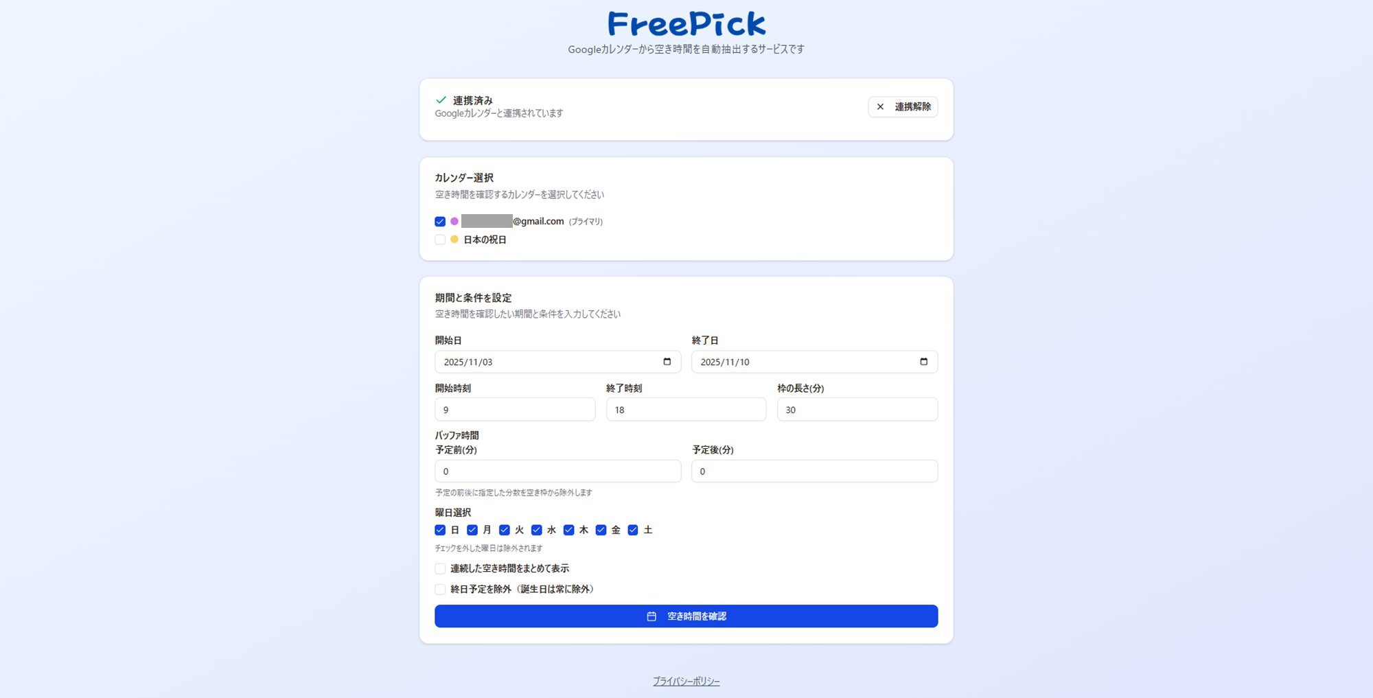 Googleカレンダーの空き時間を自動で抽出し、共有・予約調整を効率化するスケジュール調整ツール